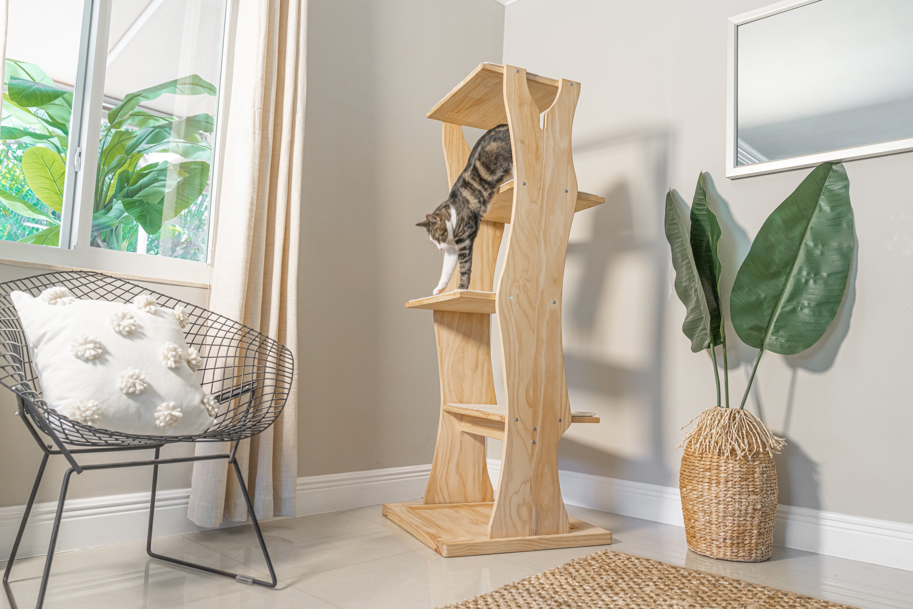 Tested by cats and their owners, our second iteration of this sleek, modern cat tower is better than ever with wider perching platforms so that cats of all shapes, sizes, and breeds can enjoy! Four sturdy wood platforms in a staggered ladder design provide your cat with plenty of vertical climbing space. Each perch is covered with a removable sisal scratchpad, designed to entice your cat to scratch the tree instead of your furniture. The durable sisal mats and sturdy wood will hold up to even the most fervent of cat scratchers.