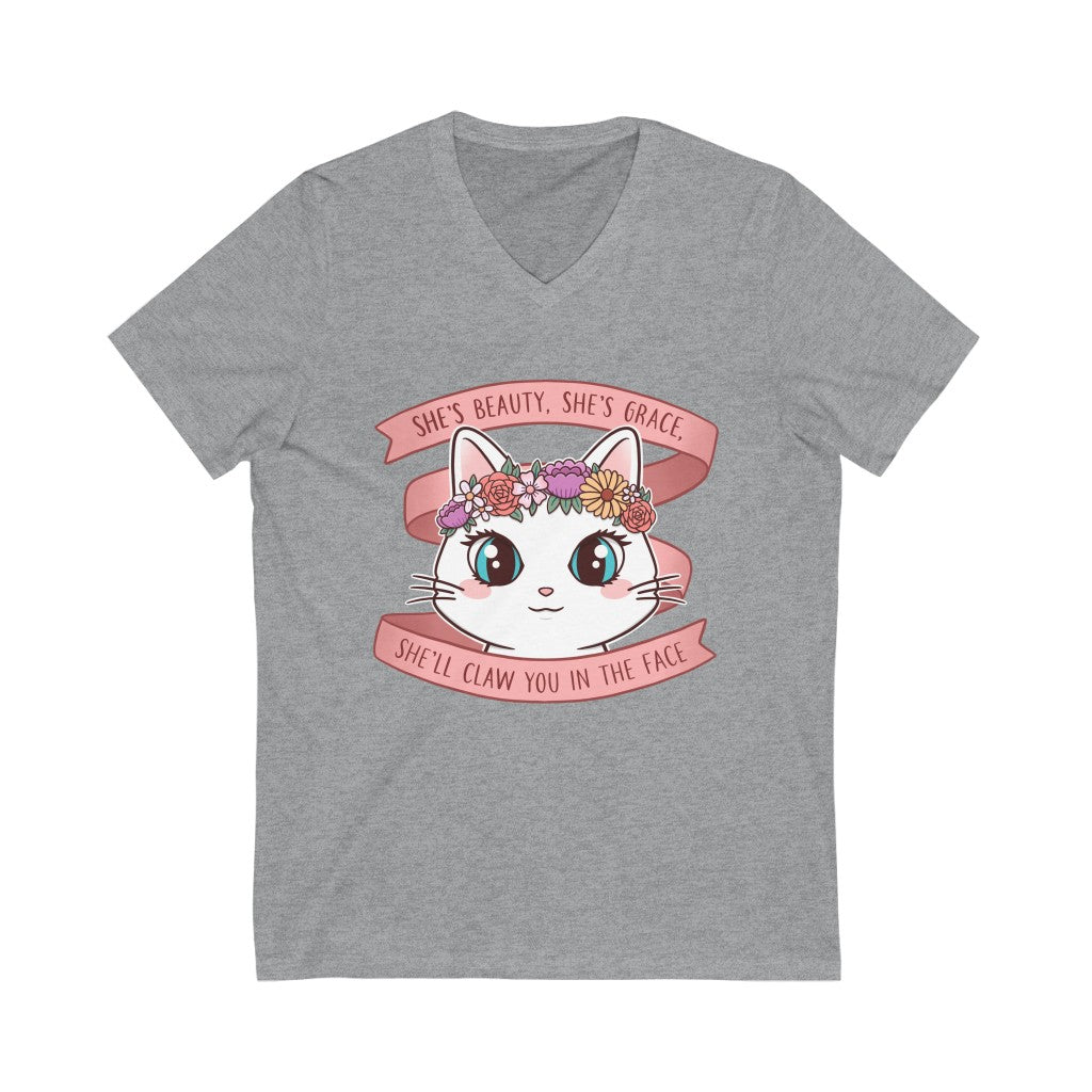 Be it a spirit of activism or a desire to rock a fiercely adorable cat t-shirt, our limited edition She's Beauty, She's Grace V-Neck Cat T-Shirt the purrfect fit.